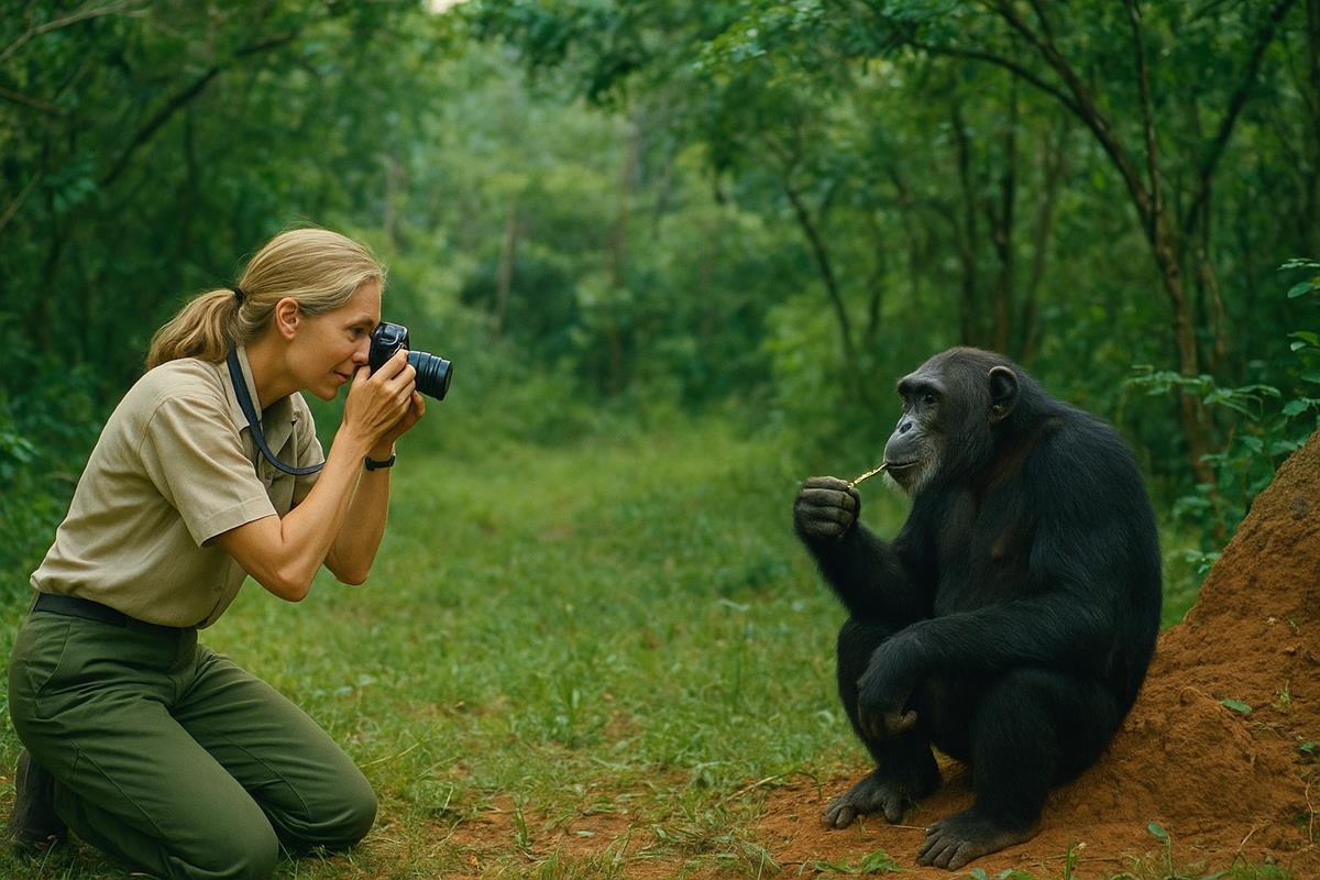 Los primeros meses fueron una prueba de fe. Desde la distancia, apenas lograba vislumbrar sombras entre las ramas. Cada día regresaba con la esperanza intacta, aunque los animales huían en cuanto percibían su presencia. Pero Jane no desistía: aprendió a esperar, a volverse parte del paisaje, a callar para escuchar. Hasta que un día, el milagro ocurrió: un macho adulto, al que bautizó como David Greybeard (David Barbagris), se dejó observar ante ella manipulando una rama para limpiarla de hojas y usarla como cebo para extraer termitas, despojando a la humanidad de su supuesta exclusividad en la fabricación de herramientas.