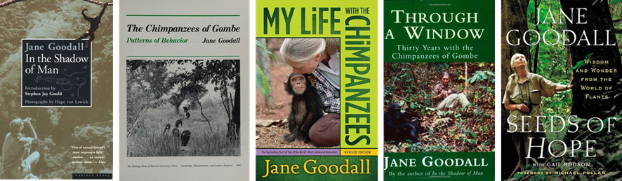 - My Life with the Chimpanzees (1988). Una autobiografía dirigida a un público más general (y también jóvenes), donde Goodall comparte su historia personal, cómo empezó su vocación, sus retos en el campo, y lo que significó para ella convivir tanto con los chimpancés.