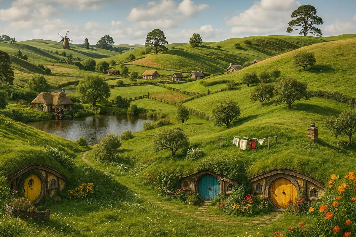 Los humanos que alguna vez decidisteis leer con fruición su historia recordaréis que La Comarca, el hogar de los entrañables hobbits, es la alegoría al mundo rural; inspirada en los paisajes de Warwickshire donde Tolkien halló su infancia. Es un canto a la vida sencilla: colinas suaves, senderos bordeados de setos, ríos que murmuran, pequeños huertos rebosantes de hortalizas, molinos de viento, hogares que se confunden con la tierra y un ritmo de vida alterado únicamente por el paso de las estaciones.