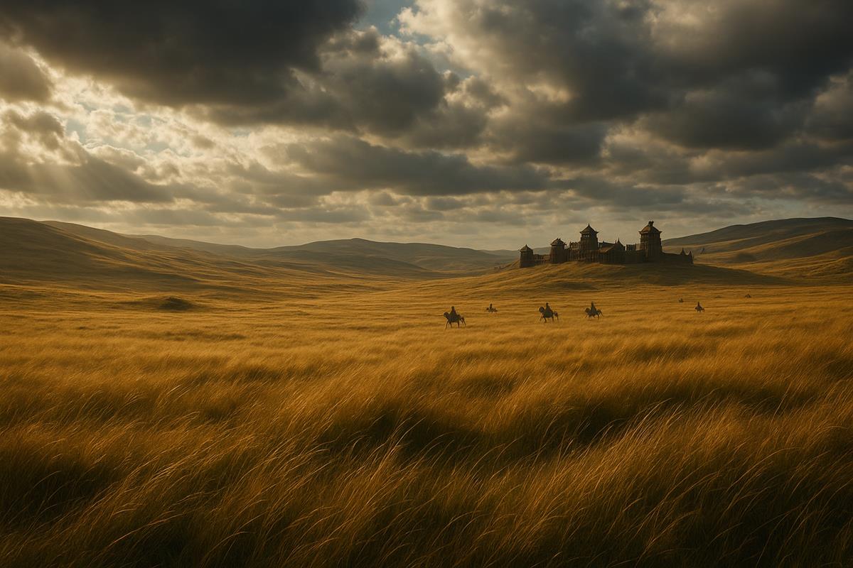 Foto 04: Las llanuras eternas de Rohan, donde el sol regala amaneceres y atardeceres que se graban por siempre en la retina. Fuente: Imagen copyleft fantaseada con inteligencia artificial.