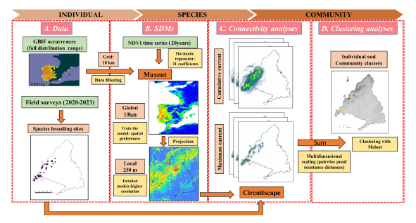 A partir de esta base de datos decampo, se desarrollaron modelos de distribución (SDMs) que estimaron la probabilidad de presencia de cada especie, teniendo en cuenta variables ambientales y teledetección (NDVI). Estos modelos se usaron para calcular la resistencia del paisaje a la dispersión de los anfibios, clave para comprender qué áreas del territorio permiten, dificultan o bloquean su desplazamiento.