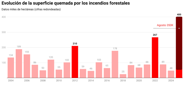Este verano, en Eapaña, han ardido en torno a 383.000 hectáreas, según el Sistema de Información Europeo de Incendios Forestales (EFFIS), afectando a 440 municipios. Con estas cifras, 2025 ya es considerado el peor año del siglo. Ha habido incendios en Tarifa (Andalucía), Las Médulas (Castilla y León), A Rúa (Galicia), Jarilla (Extremadura)…